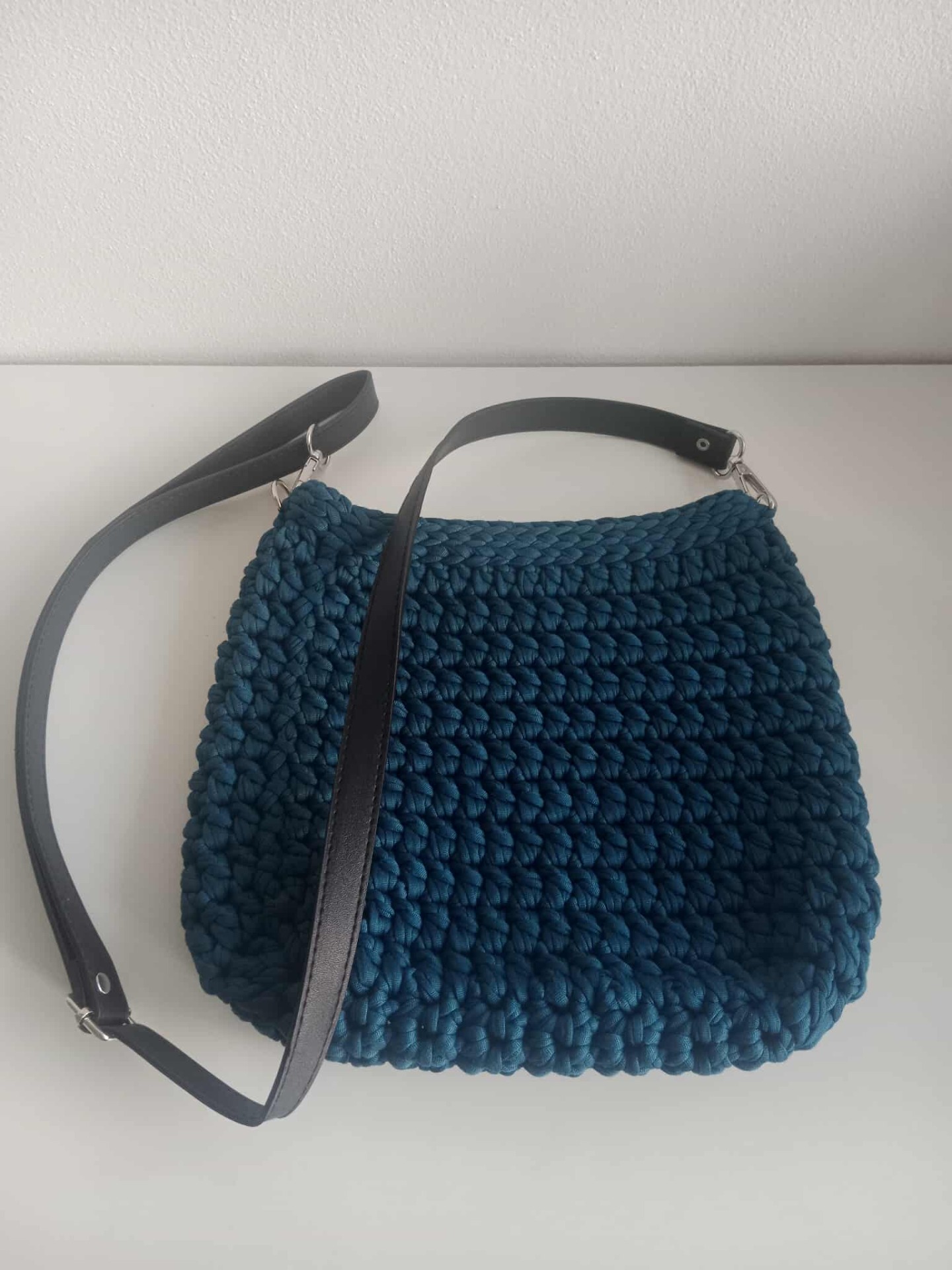 Háčkovaná taška z tričkoviny s koženým popruhem, který je nastavitelný.